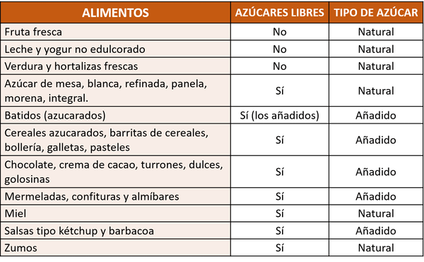 Los azúcares naturales de las frutas, verduras, hortalizas frescas y leche no son considerados libres y, por lo tanto, son recomendados. Los del azúcar de mesa, la miel, los zumos, los jugos de fruta y los concentrados de jugos de fruta (zumos), sí son azúcares libres y debemos evitarlos.